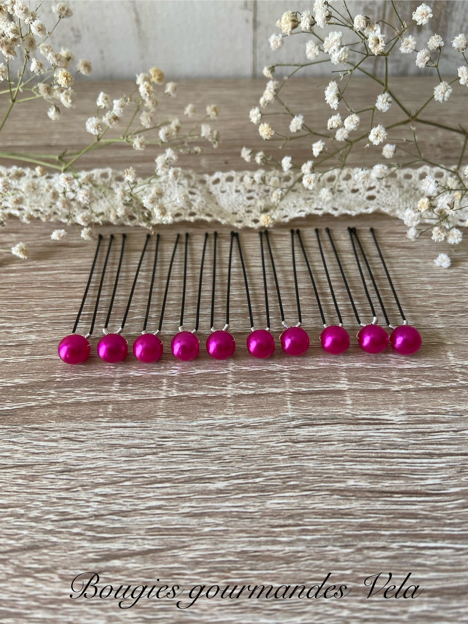 Lot de 10 épingles cheveux ornées de perles nacrées fuchsias.