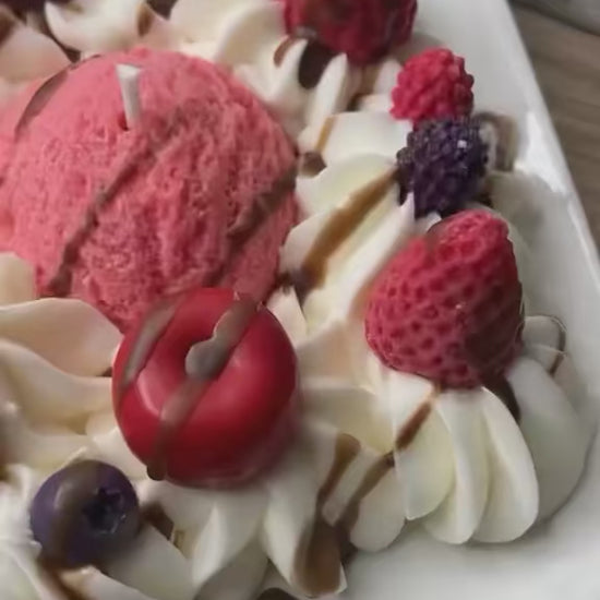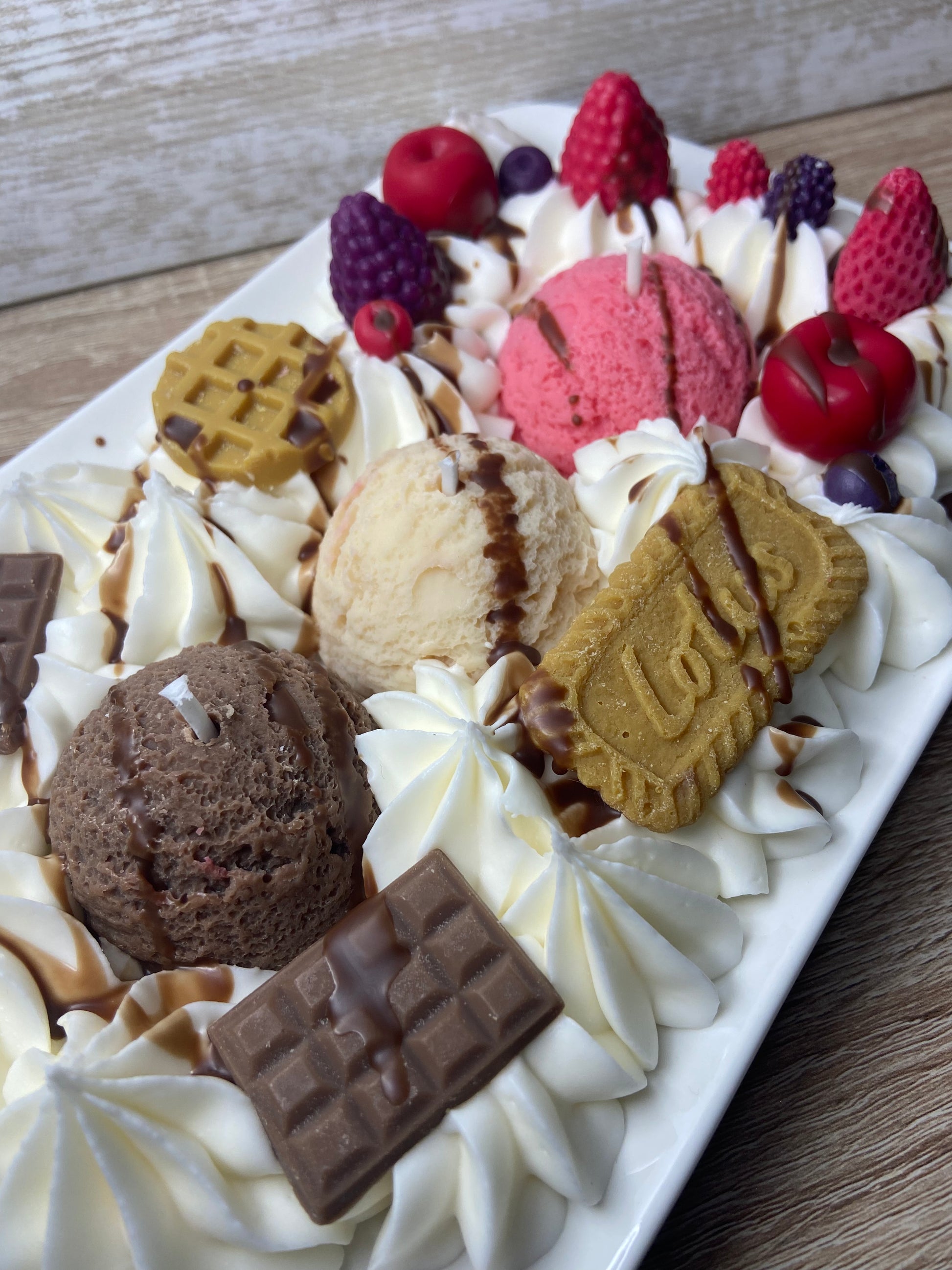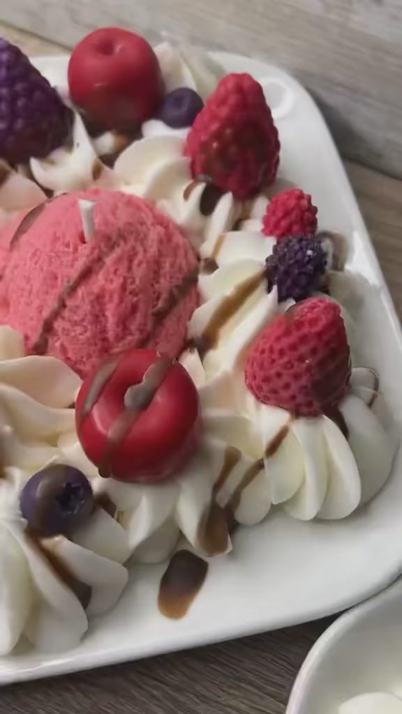 Bougie gourmande dessert glace chantilly parfum vanille, fruits rouges et chocolat, en cire de soja et parfum de Grasse dans un plat 25cm x 16cm.