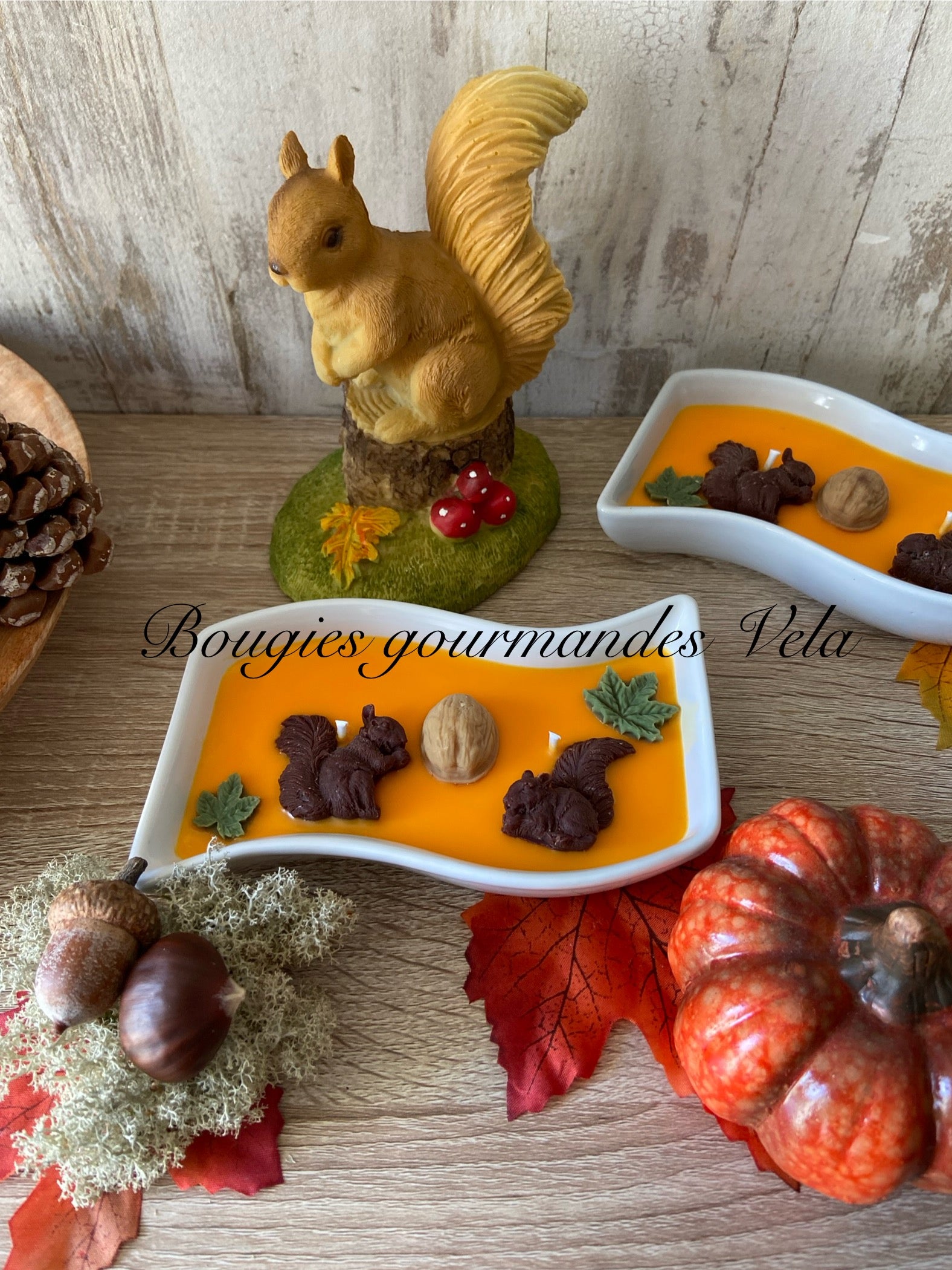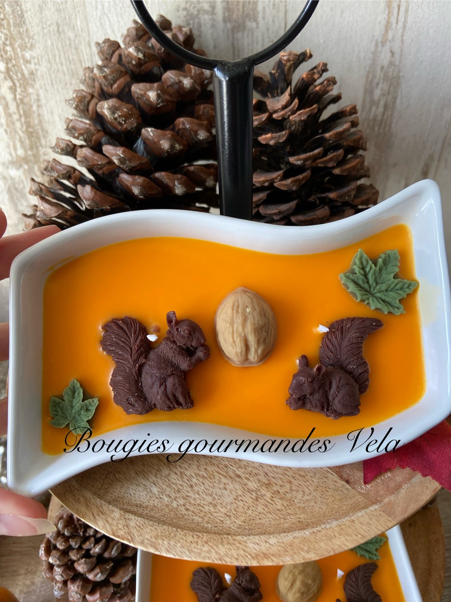 Bougie parfum citrouille blanche ambrée avec écureuils en cire de soja 150 grammes et parfum de Grasse dans un pot blanc.