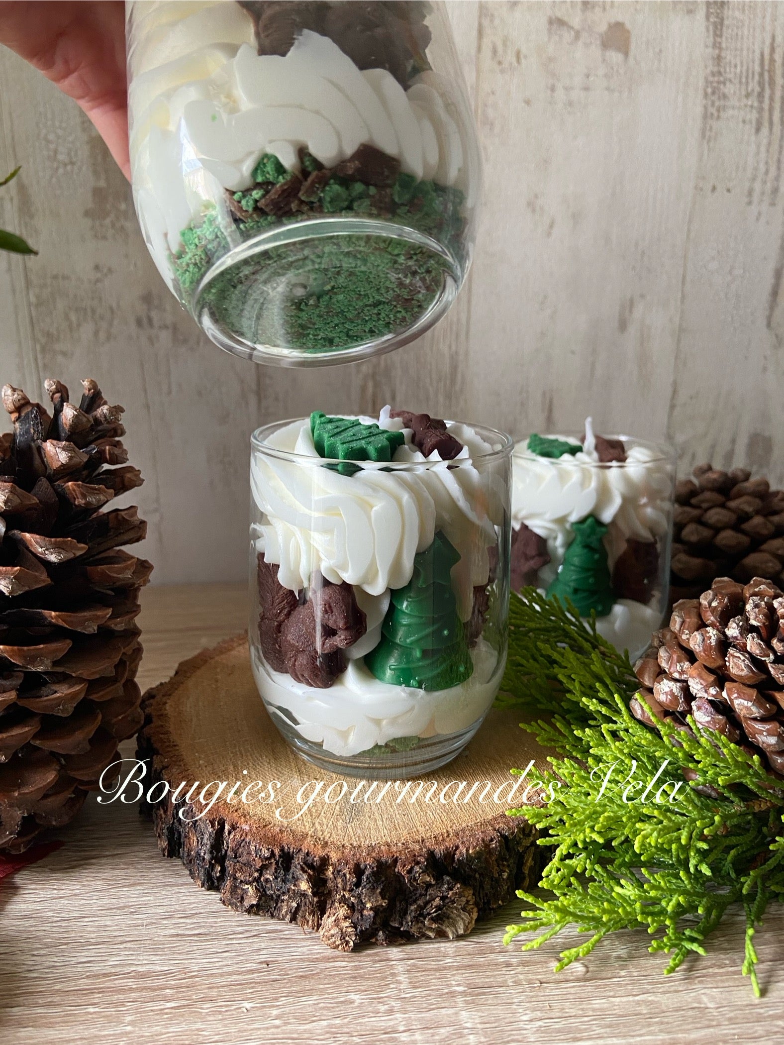 Bougie gourmande parfum sapin de Noel avec ecureuil, sapin et pomme de pin en cire de soja 200g et parfum de Grasse dans un verre.