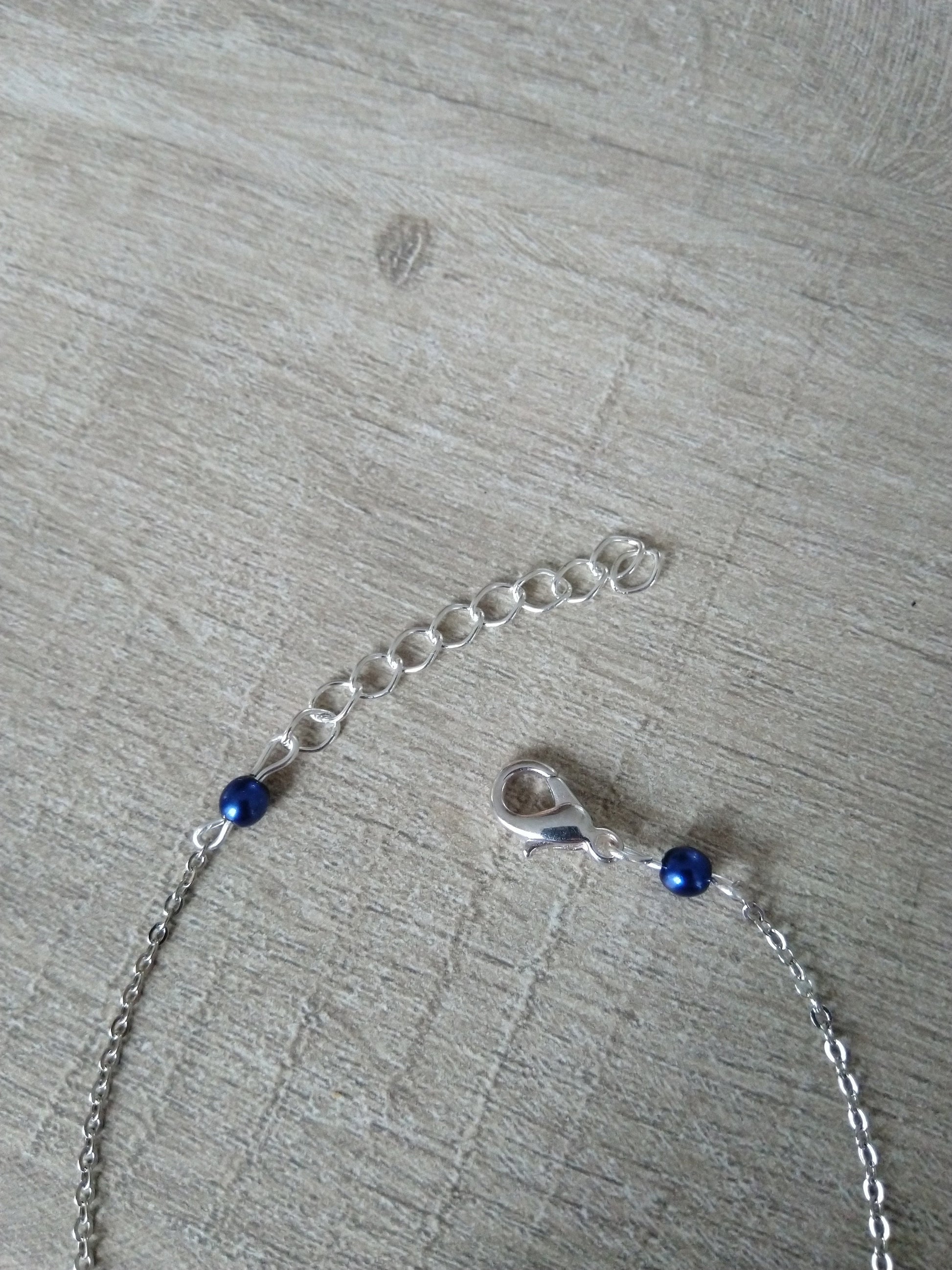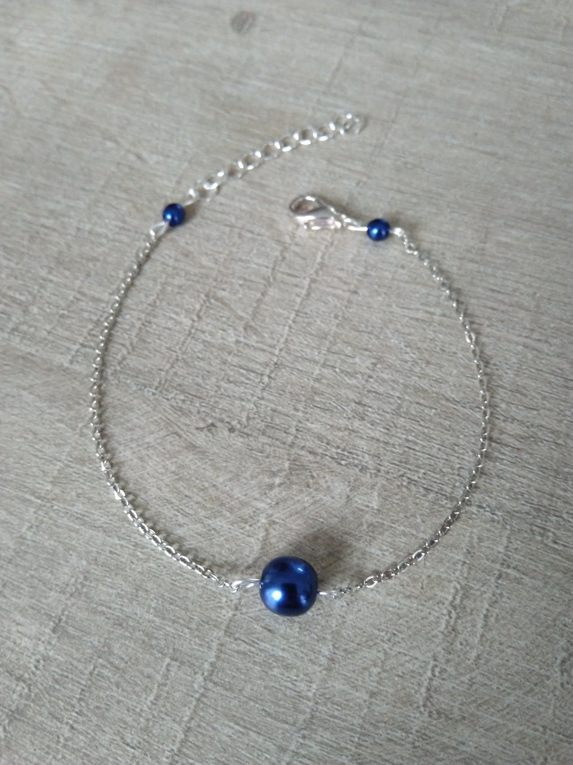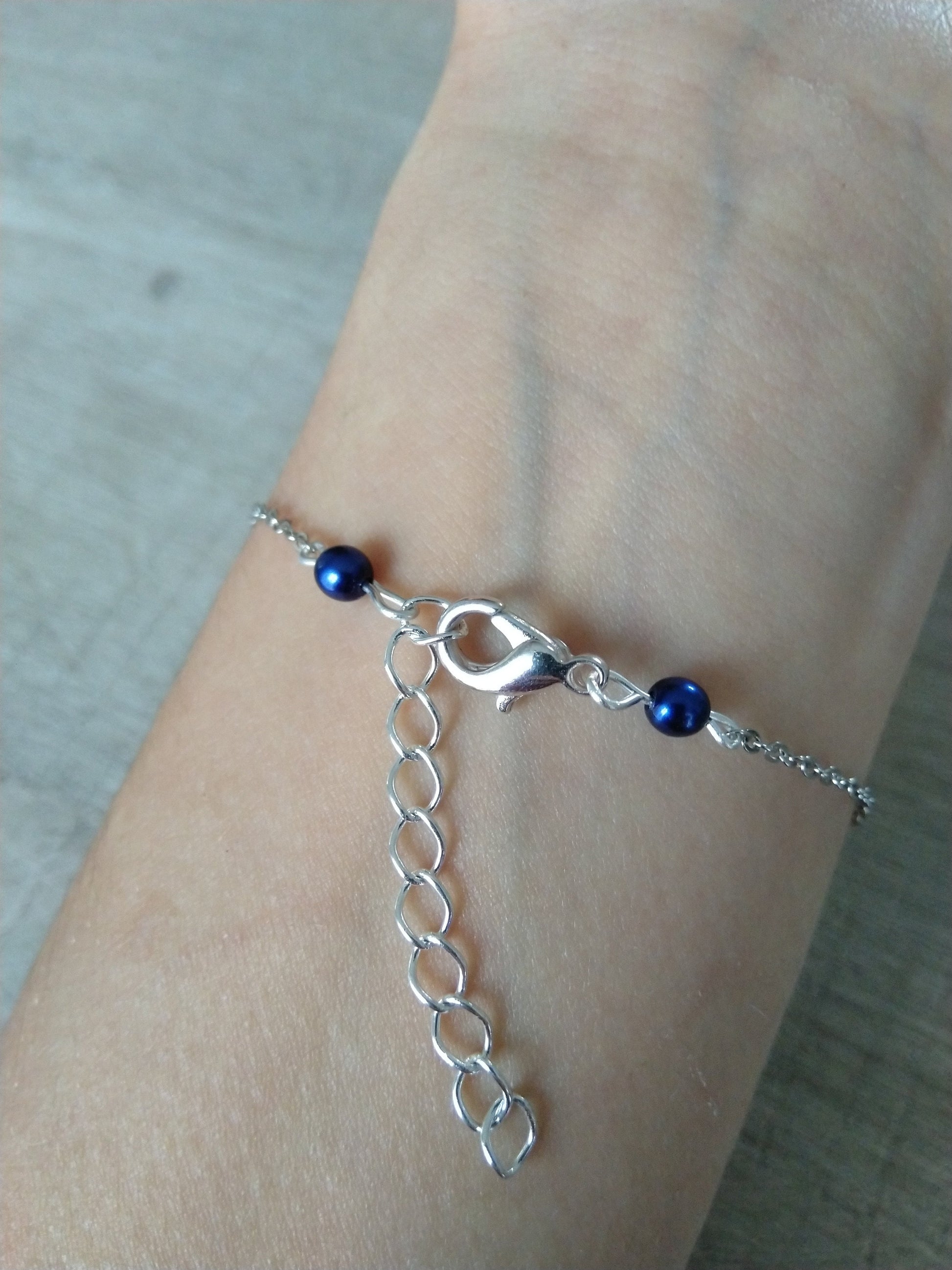 Découvrez ce joli bracelet composé de perles nacrées bleu marine sur une fine chaîne argentée.