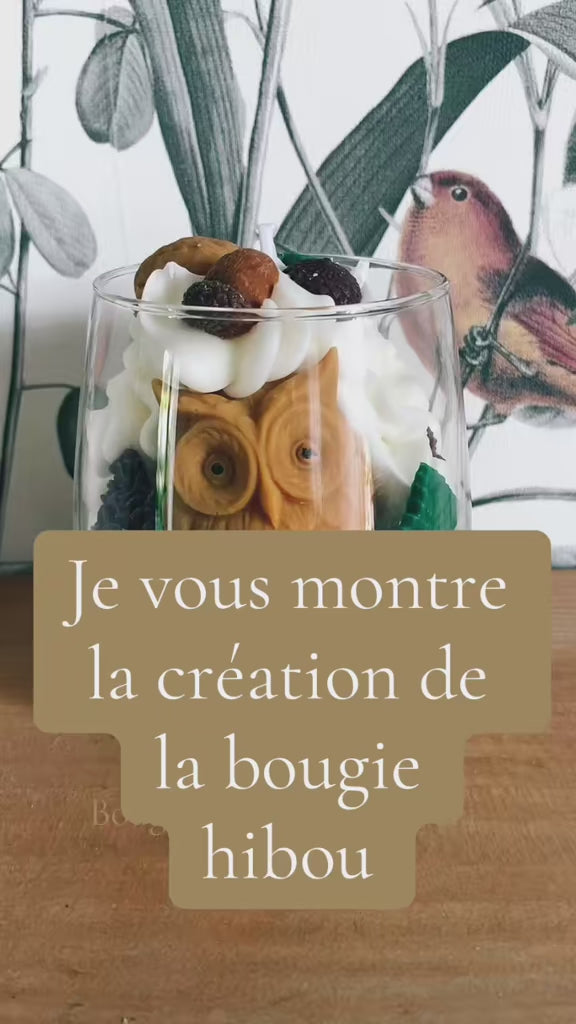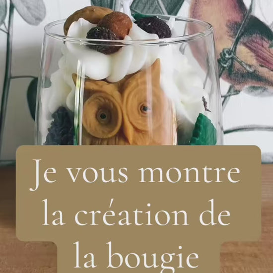 Bougie gourmande « Le hibou de la forêt » parfumée en cire de soja 200g et parfum de Grasse dans un verre.