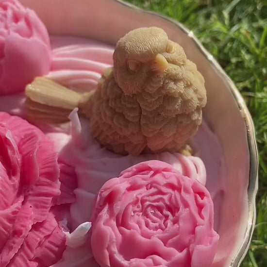 Bougie parfum pivoine avec un oiseau et des fleurs en cire de soja 479 grammes et parfum de Grasse dans une pot beige.